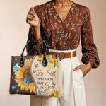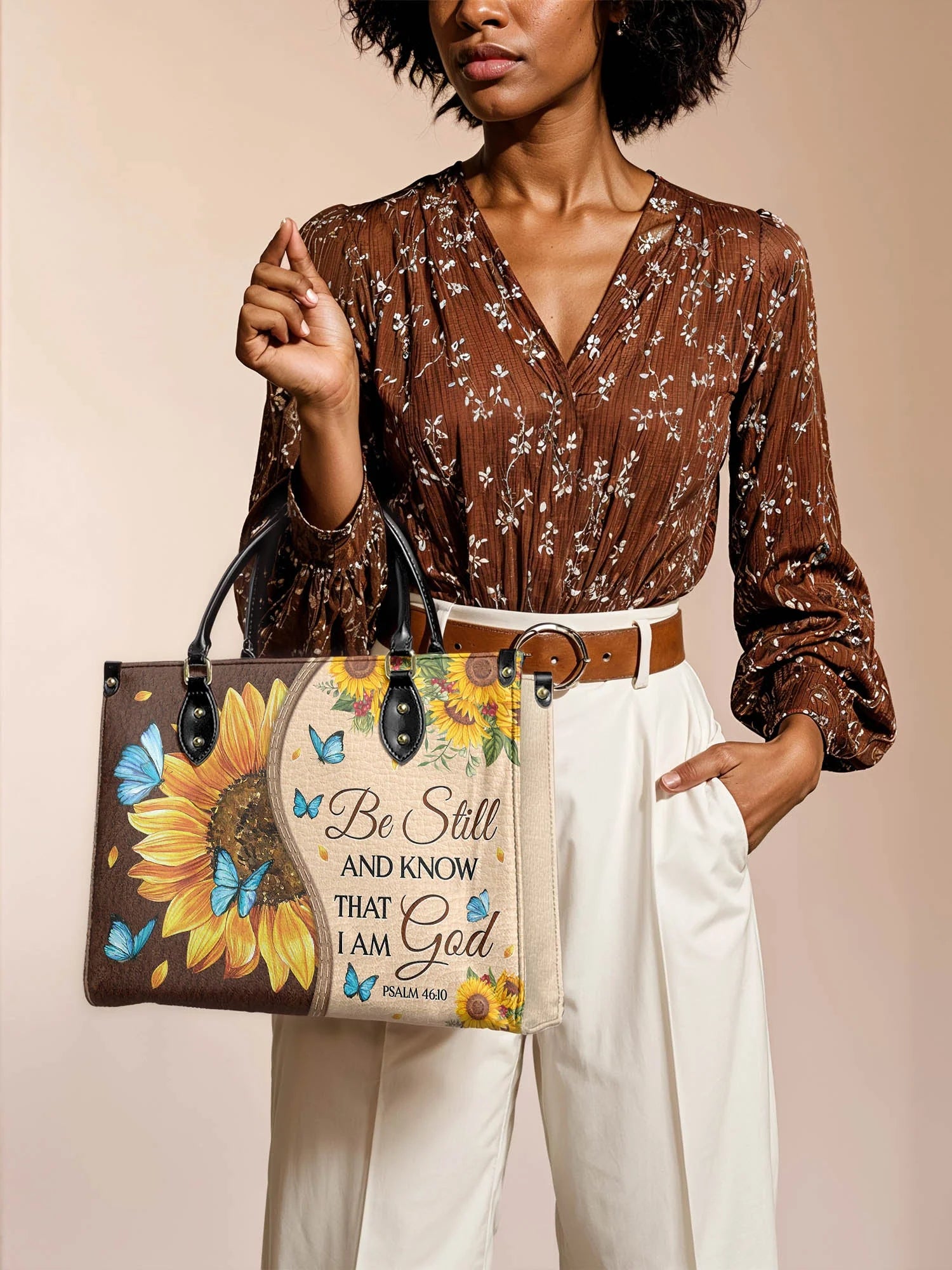 Embrace peace and trust in God’s plan with this beautifully designed leather handbag.