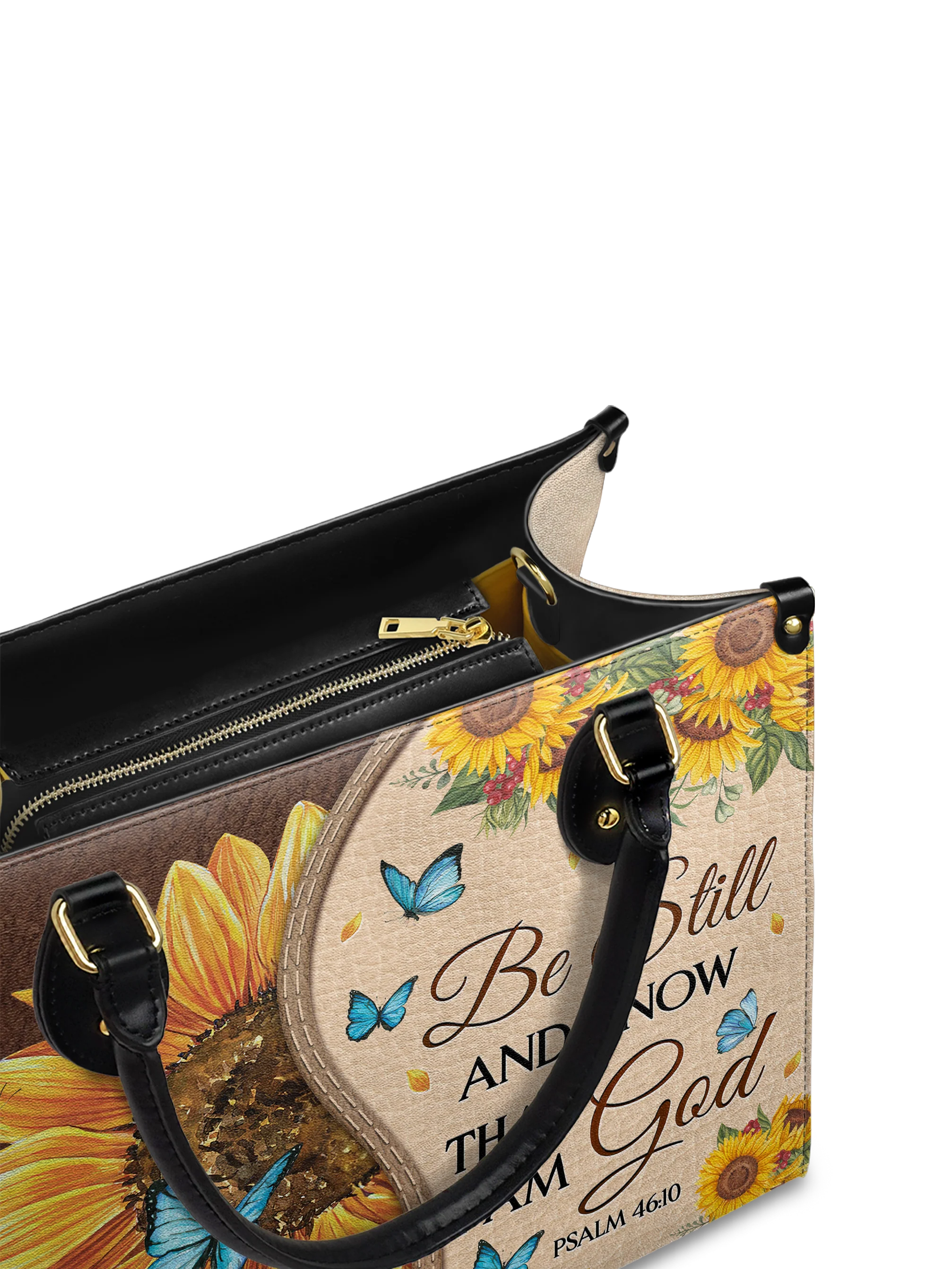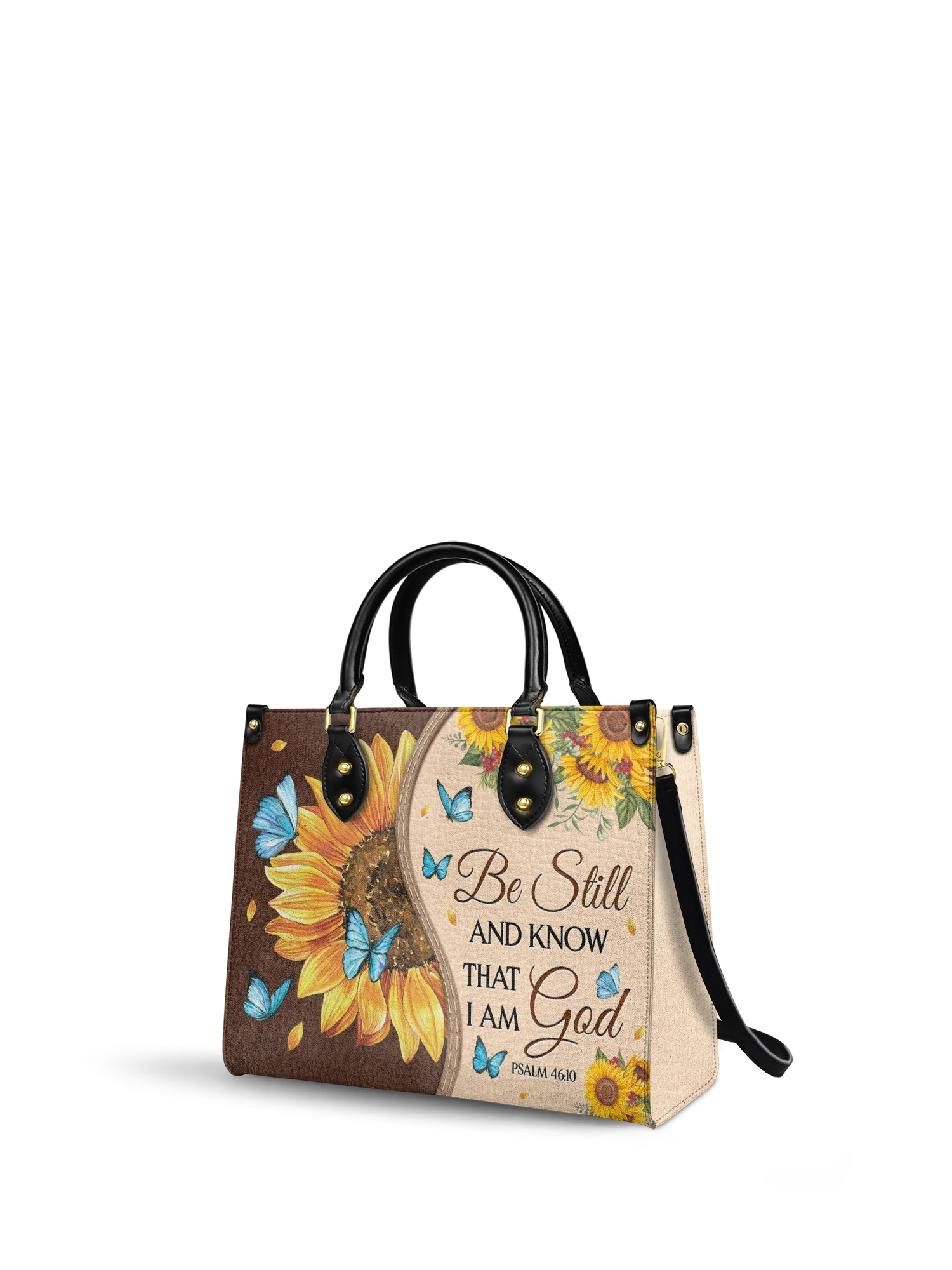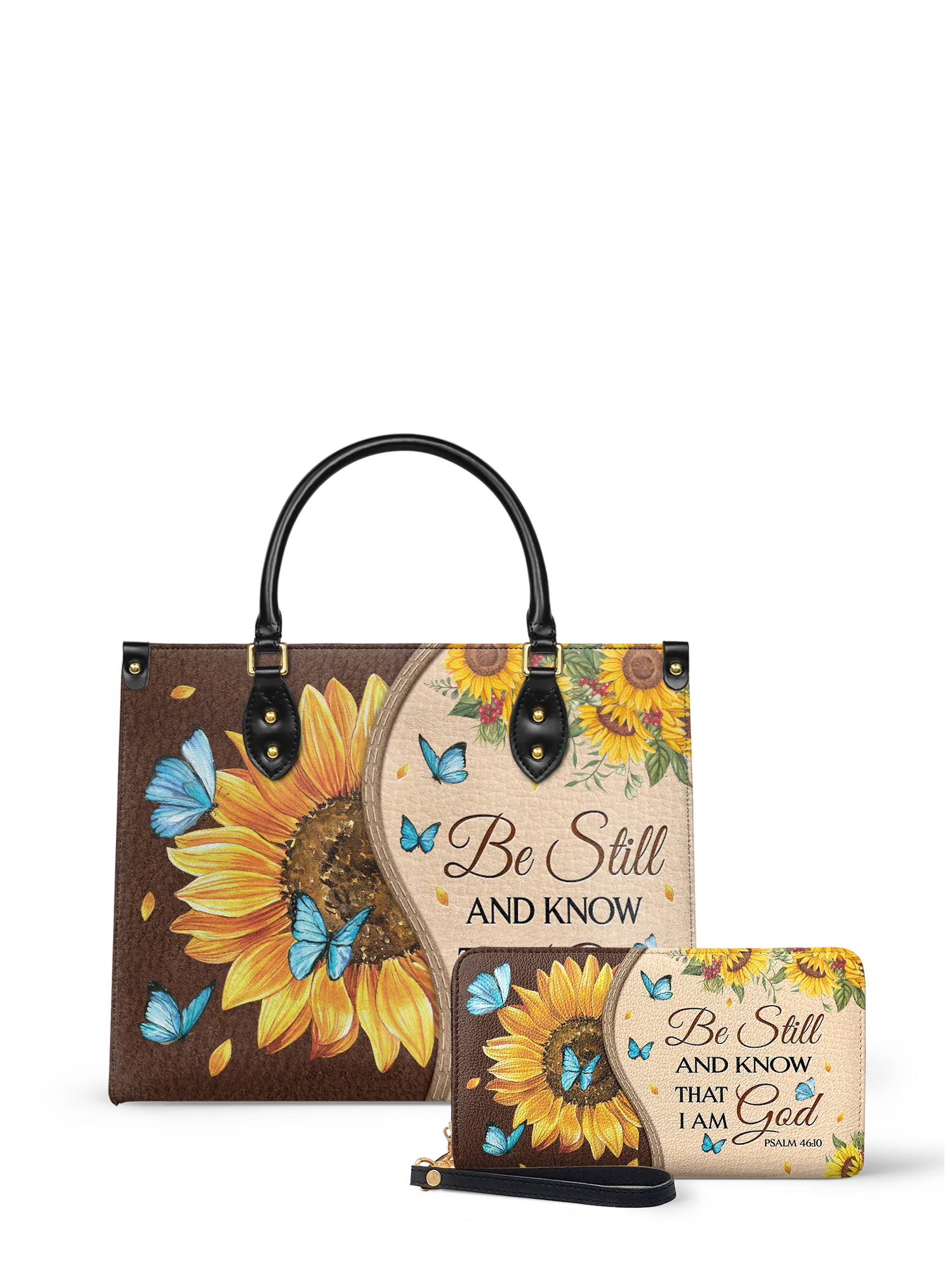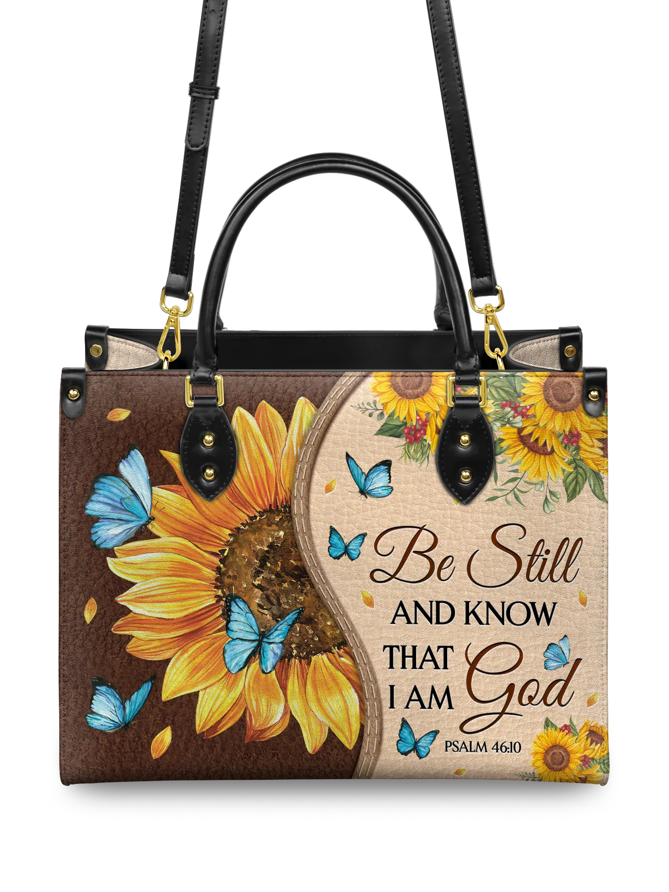 Featuring Psalm 46:10, it serves as a gentle reminder to be still and rest in His presence. The sunflower symbolizes faith and hope, while delicate butterflies reflect transformation and grace.