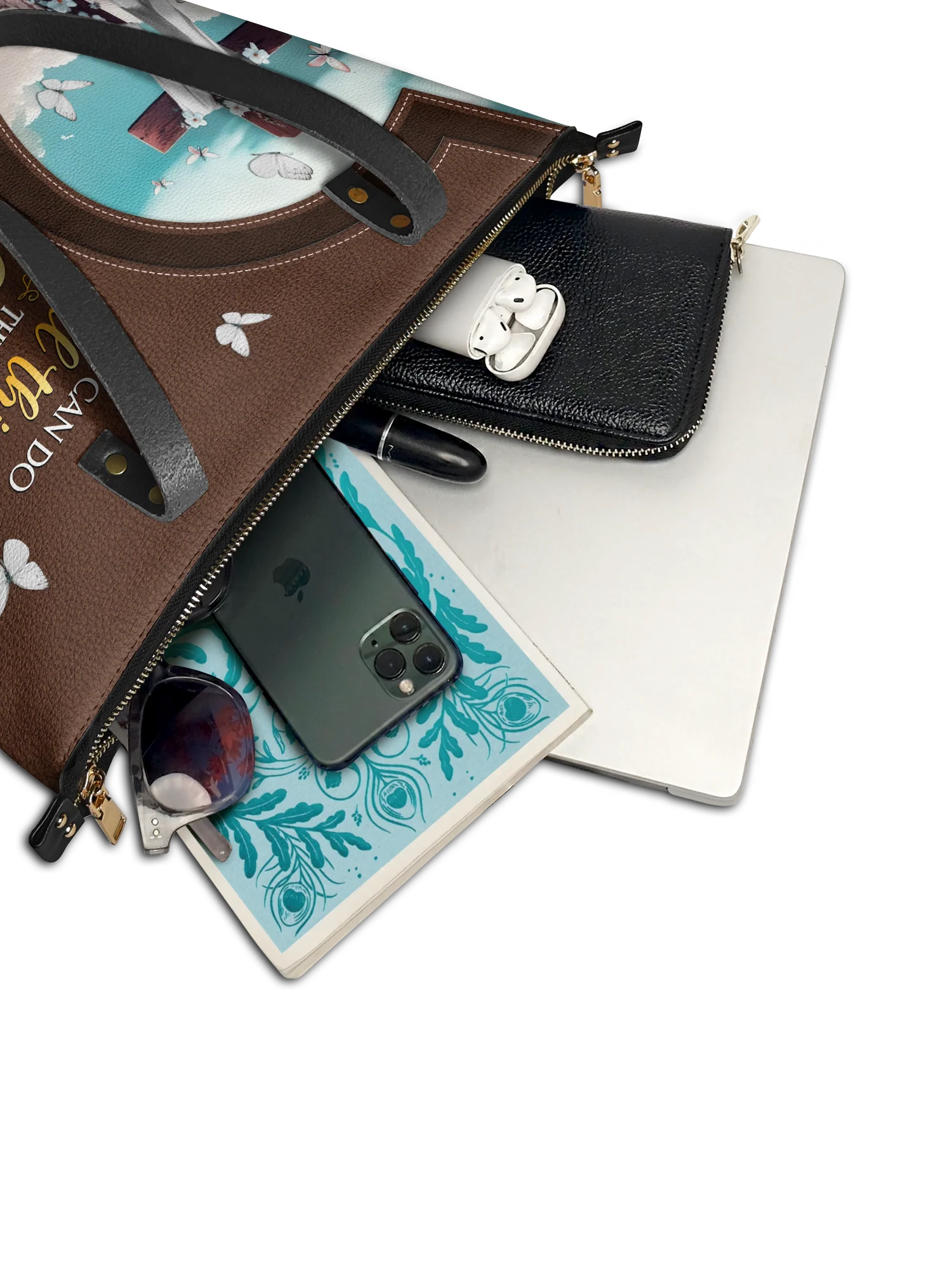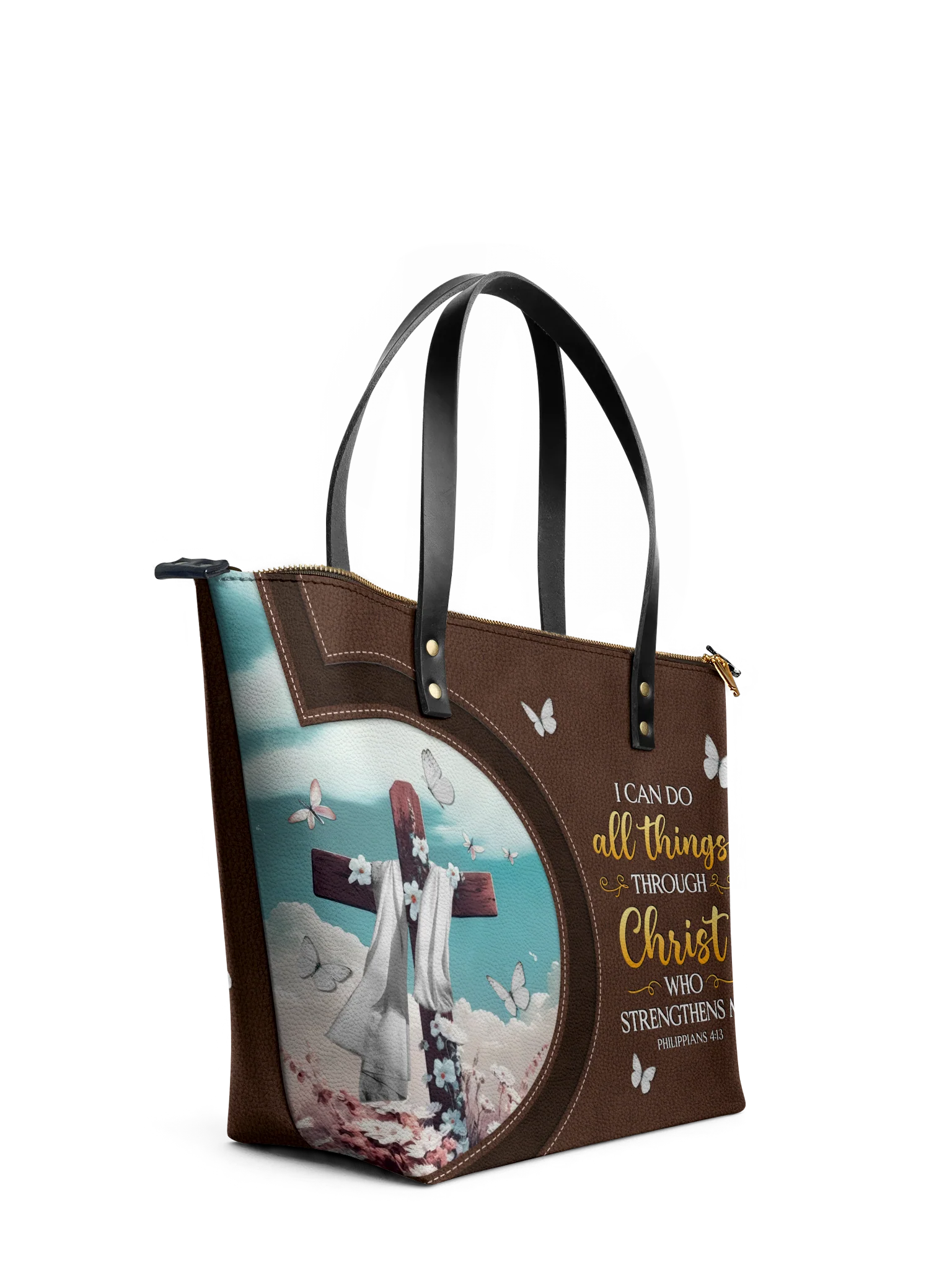 "Rise" - Philippians 4:13 Leather Tote Bag